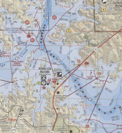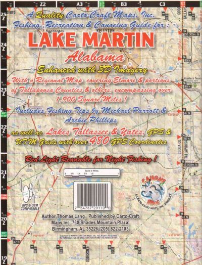 This map is great for fishing and navigating the lake on water or by road. This map contains Yates and Tallassee Lakes downstream from Lake Martin.
