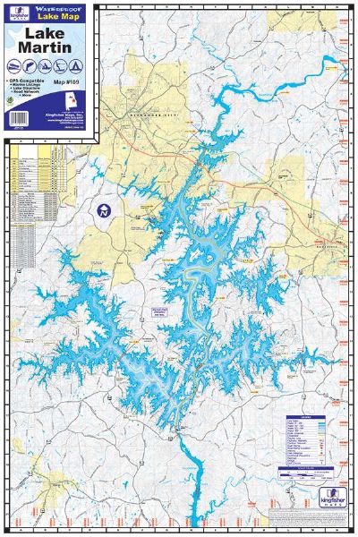 Lake Martin 24″x 36″ One-sided. Scale 1:54,000 Waterproof and Tear Resistant! GPS Compatible, Marina Listings, Lake Structure, Road Network and More.