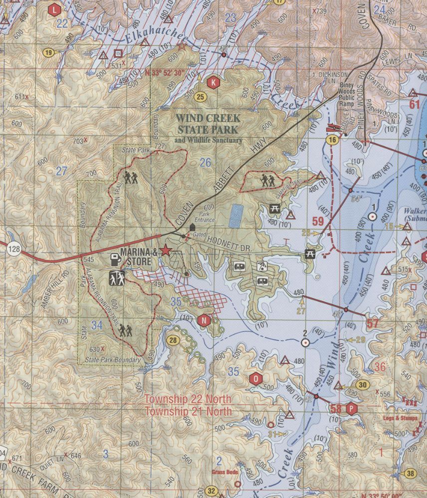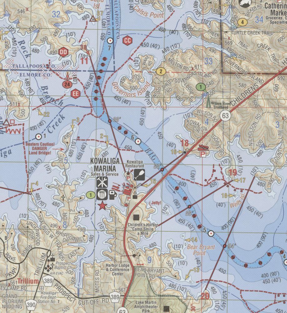 This map is great for fishing and navigating the lake on water or by road. This map contains Yates and Tallassee Lakes downstream from Lake Martin.
