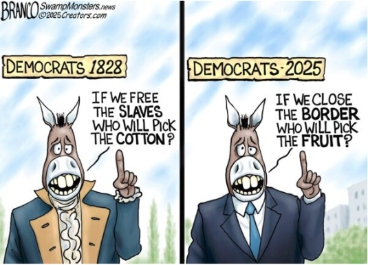 The following cartoon is so spot on it's not even remotely funny. Democrats have always needed an underclass. First it was slaves. Then LBJ came along with the Great Society to make them slaves to govt handouts and reliable Democrat votes. Then it was Democrats the opposed equal rights and imposed Jim Crow. And today it's Democrats needing an underclass of illegal aliens to prop up census numbers for sanctuary states and to pick the fruit and mow the lawn.